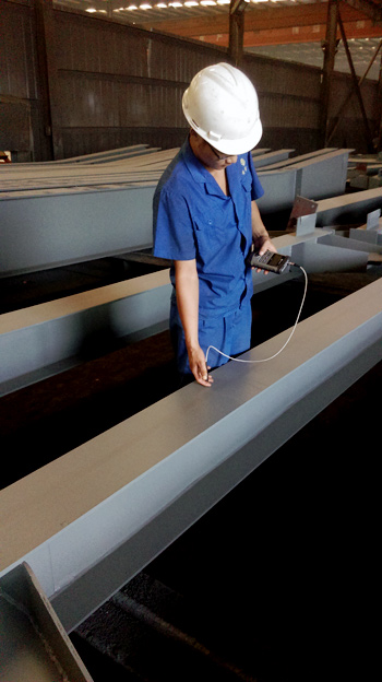 質(zhì)檢員正在使用超聲波探傷儀探傷構(gòu)件焊接質(zhì)量 | 質(zhì)檢員正在使用測厚儀檢測構(gòu)件漆膜厚度 |