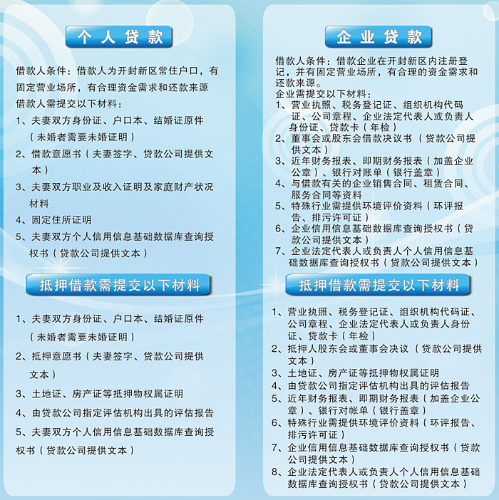 開封市開封新區(qū)開寶小額貸款有限公司(以下簡稱開寶小貸)是一家民營股份制公司,注冊資金壹億元。公司主營業(yè)務(wù)為辦理小額貸款,提供財務(wù)咨詢等,同時滿足中小企業(yè)短期資金需求。公司嚴(yán)格按照“只貸不存”的原則,以自有資金發(fā)放貸款;竭誠為中小企業(yè)、個體工商戶提供支持與幫助。