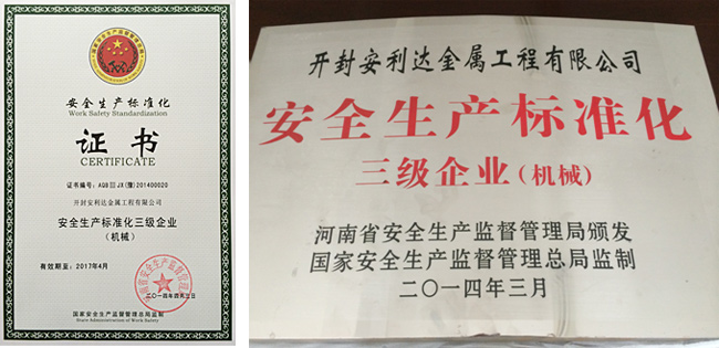 2014年6月,開封市安全生產監(jiān)督管理局為開封安利達金屬工程有限公司頒發(fā)“國家安全生產標準化三級企業(yè)”證書。